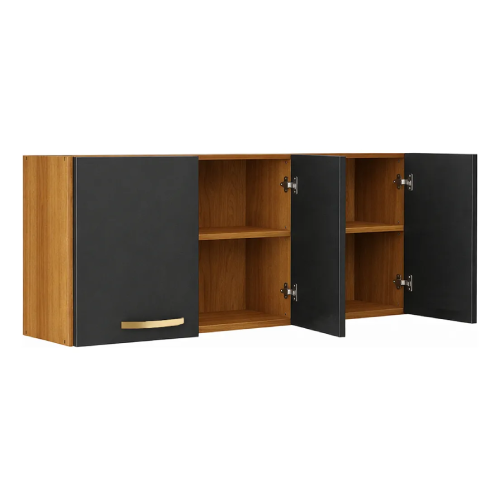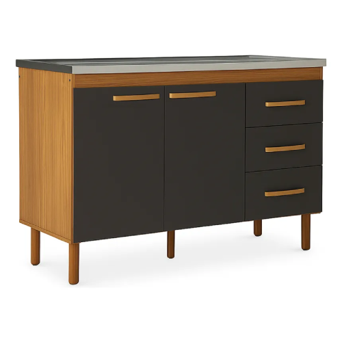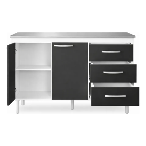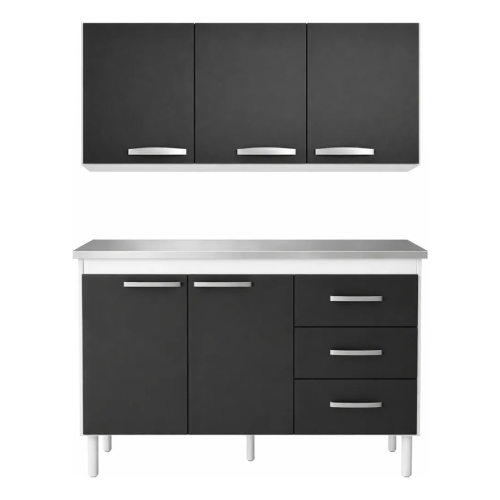 La alacena con 3 puertas y estantes internos te permite ordenar alimentos, vajilla o utensilios de forma cómoda. El bajo mesada incorpora 3 cajones con correderas metálicas para apertura suave y 2 puertas que facilitan el acceso a ollas y elementos de uso diario. Fabricado en MDP de 15 mm, ofrece buena resistencia para el uso cotidiano y una excelente relación precio-calidad.